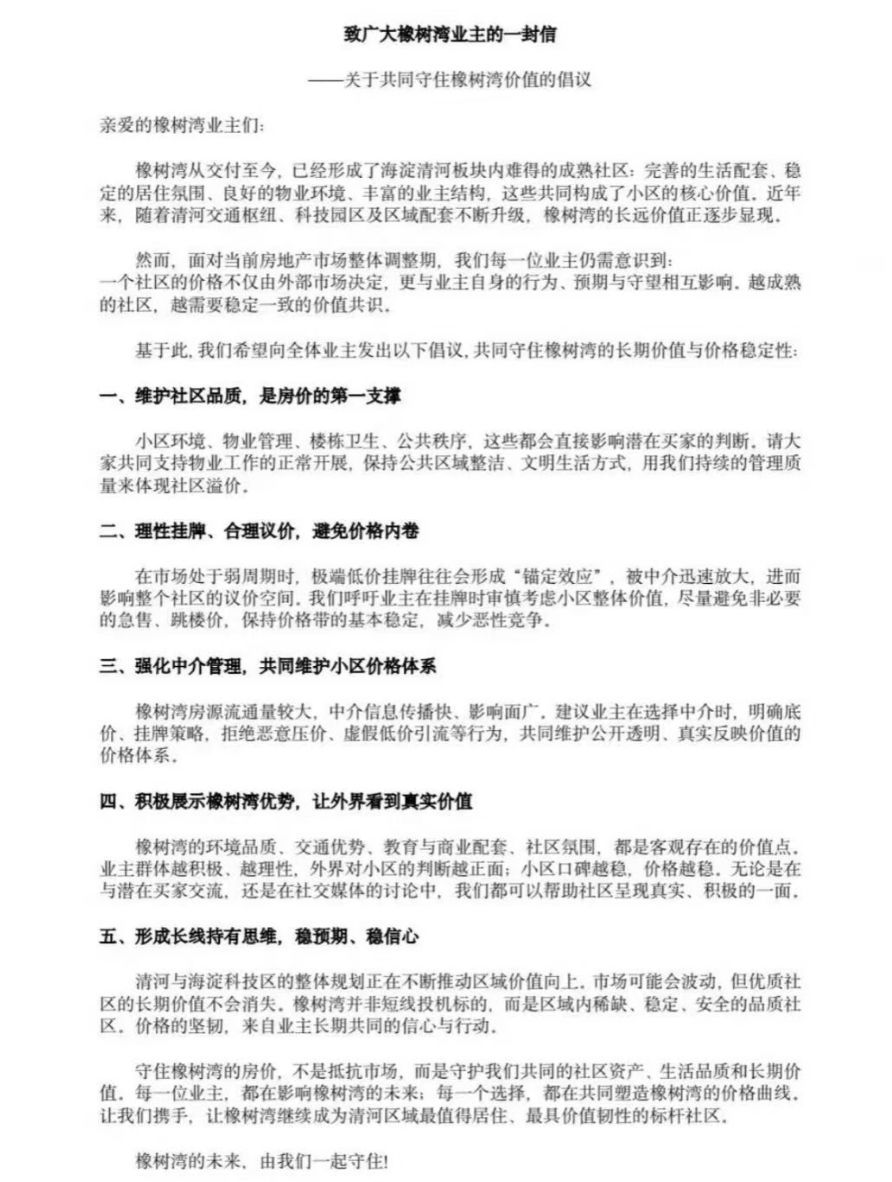 《致广大橡树湾业主的一封信》显示:“在市场处于弱周期时,极端低价挂牌往往会形成锚定效应,被中介迅速放大,影响整个社区的溢价空间。建议业主在选择中介时,明确底价、挂牌策略,拒绝恶意压价、虚假低价引流等行为。”