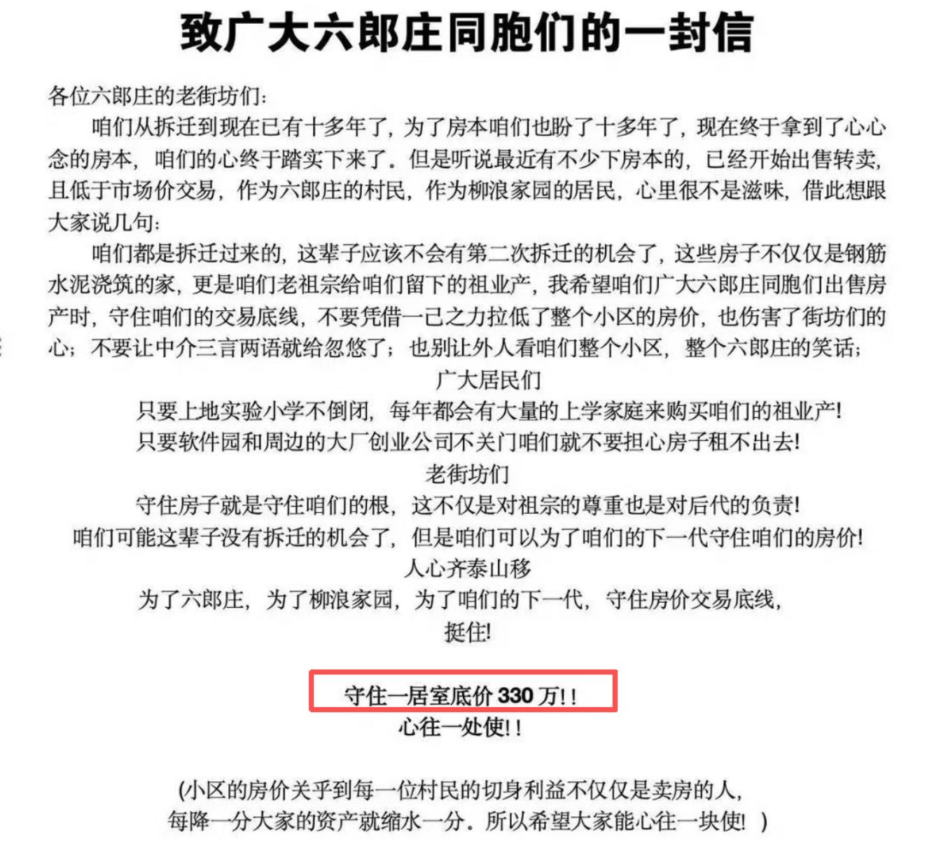 《致广大六郎庄同胞们的一封信》内容显示:“只要上地实验小学不倒闭,每年都会有大量上学家庭来买房;只要软件园和周边的大厂、创业公司不关门,咱们就不要担心房子租不出去……咱们可能这辈子没有拆迁机会了,但是咱们可以为了下一代守住房价。”