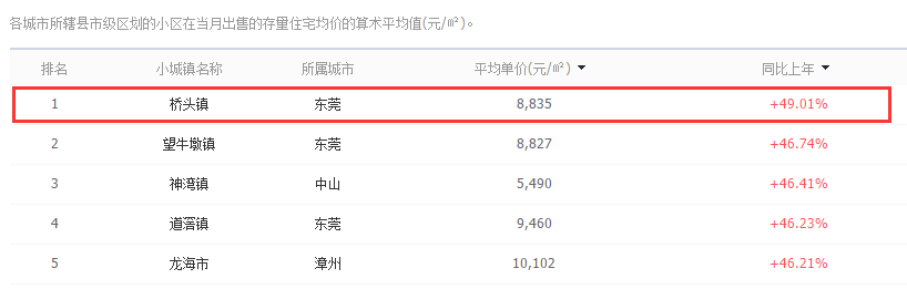 在上述排行榜中,涨价态势最为明显的,是近年来房价新贵——深圳的周边城市。深圳的房价自不必多言,而由此带动的周边小城镇住宅价格涨价潮也尤为凶猛,数据显示,8月同比涨价最快的30个小城镇中,有22个来自深圳周边的中山、东莞、惠州等区域,位于东莞的桥头镇以接近50%的涨幅占据鳌头。