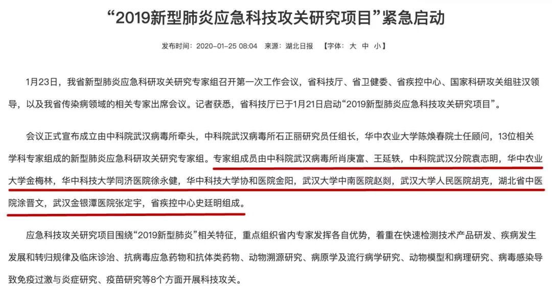 1月21日,湖北省启动“2019新型肺炎应急科技攻关研究项目”,由武汉病毒研究所牵头,石正丽任组长,13位专家共同组成科研攻关专家组,开展联合攻关。值得注意的是,此前任职资历饱受争议的武汉病毒研究所所长王延轶,也在名单之列。