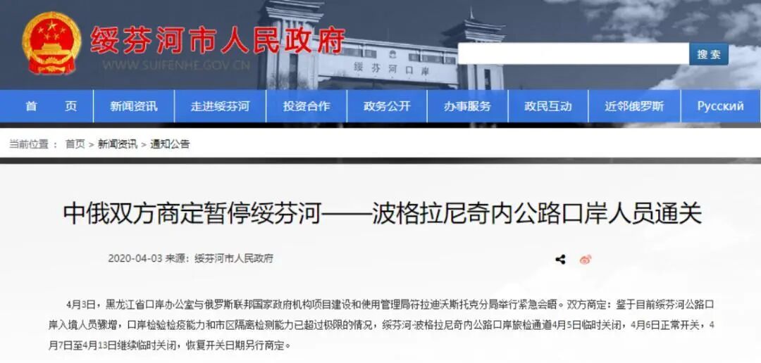 入境人员骤增,口岸检验检疫能力和市区隔离检测能力已超过极限。4月3日,绥芬河市政府发布通知,绥芬河-波格拉尼奇内公路口岸旅检通道4月5日临时关闭,4月6日正常开关,4月7日至4月13日继续临时关闭,恢复开关日期另行商定。