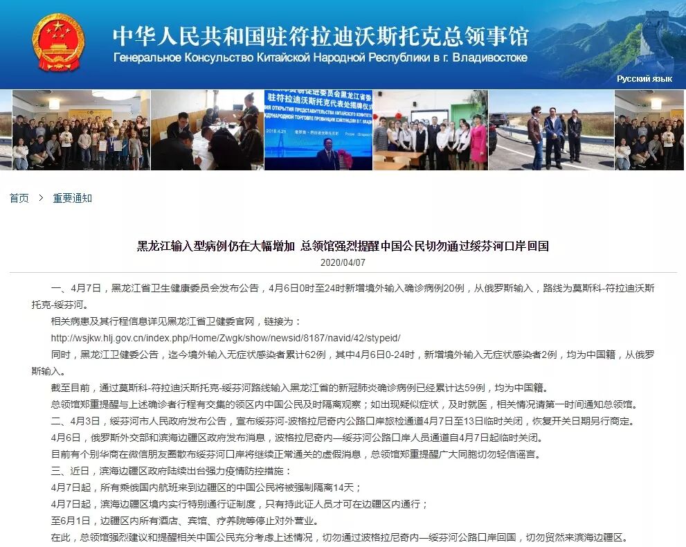 为此,4月5日、6日、7日三天,中国驻符拉迪沃斯托克总领事馆连续发布出行风险通告,强烈提醒中国公民切勿通过绥芬河口岸回国。
