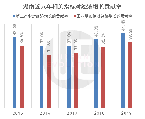 在此之后,一度分别跌至37%和31.6%的数据,逐年回升。到2019年,湖南第二产业对经济增长的贡献率,已超过下跌前的2015年2.4个百分点,约为44.4%;与此同时,湖南工业增加值对经济增长的贡献率,2018年就恢复至2015年左右水平,2019年又进一步上升至39.3%。