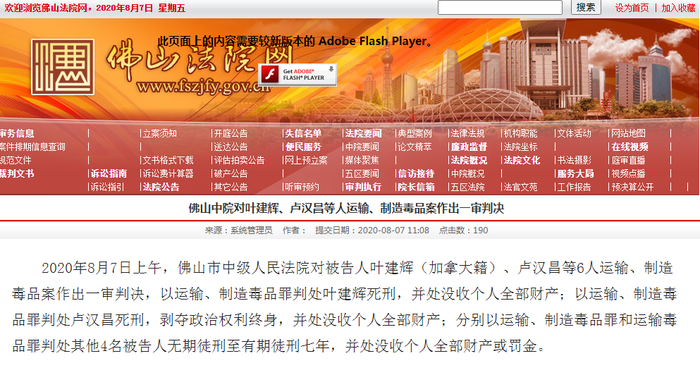 8月7日上午,广东省佛山市中级人民法院对被告人叶建辉(加拿大籍)、卢汉昌等6人运输、制造毒品案作出一审判决,以运输、制造毒品罪判处叶建辉死刑,并处没收个人全部财产;以运输、制造毒品罪判处卢汉昌死刑,剥夺政治权利终身,并处没收个人全部财产;分别以运输、制造毒品罪和运输毒品罪判处其他4名被告人无期徒刑至有期徒刑七年,并处没收个人全部财产或罚金。