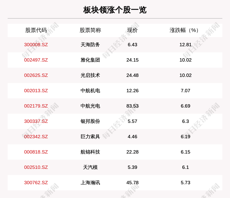 每经AI快讯,军工板块走强,板块内161只上涨,12只平盘,63只下跌,天海防务、雅化集团、光启技术分别涨12.81%、10.02%、10.02%。