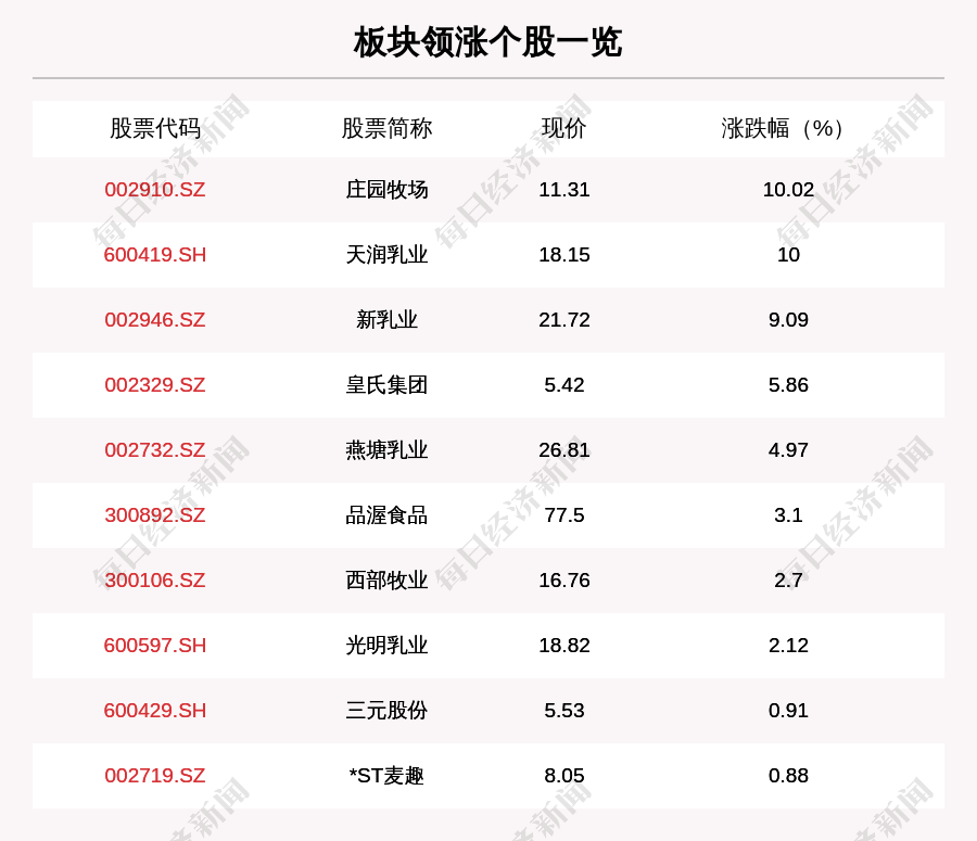 每经AI快讯,乳业奶粉板块走强,板块内11只上涨,4只下跌,庄园牧场、天润乳业、新乳业分别涨10.02%、10.0%、9.09%。