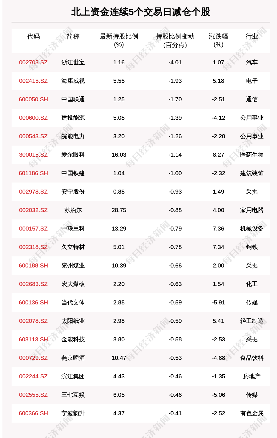 每经AI快讯,1月7日,北上资金连续5个交易日卖出43个股。北上资金连续5个交易日减仓个股中,浙江世宝(002703.SZ,收盘价:5.68元)减持比例增幅最大,5个交易日减持4.01百分点,其他跌幅较大的个股包括海康威视(002415.SZ,收盘价:58.29元)、中国联通(600050.SH,收盘价:4.28元)、建投能源(000600.SZ,收盘价:5.12元),分别减持1.93个百分点、1.70个百分点、1.39个百分点。