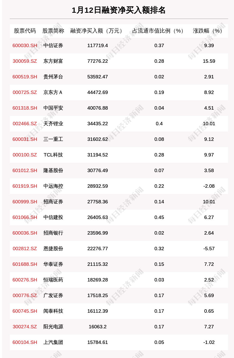 1月12日两市共有833只个股有融资资金净买入。共有46只股票融资净买入额占总成交金额比例超10%,其中江河集团、华能水电、宋都股份排名前三,占比分别为34.81%、34.27%、26.82%。