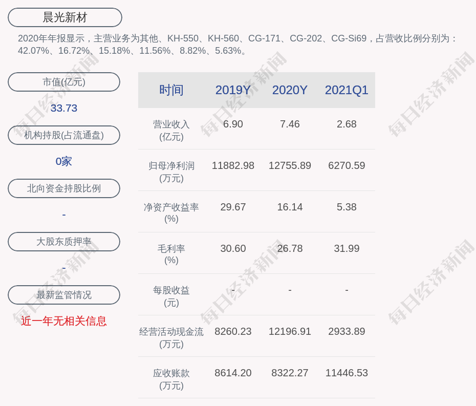 2020年年报显示,晨光新材的主营业务为其他、KH-550、KH-560、CG-171、CG-202、CG-Si69,占营收比例分别为:42.07%、16.72%、15.18%、11.56%、8.82%、5.63%。