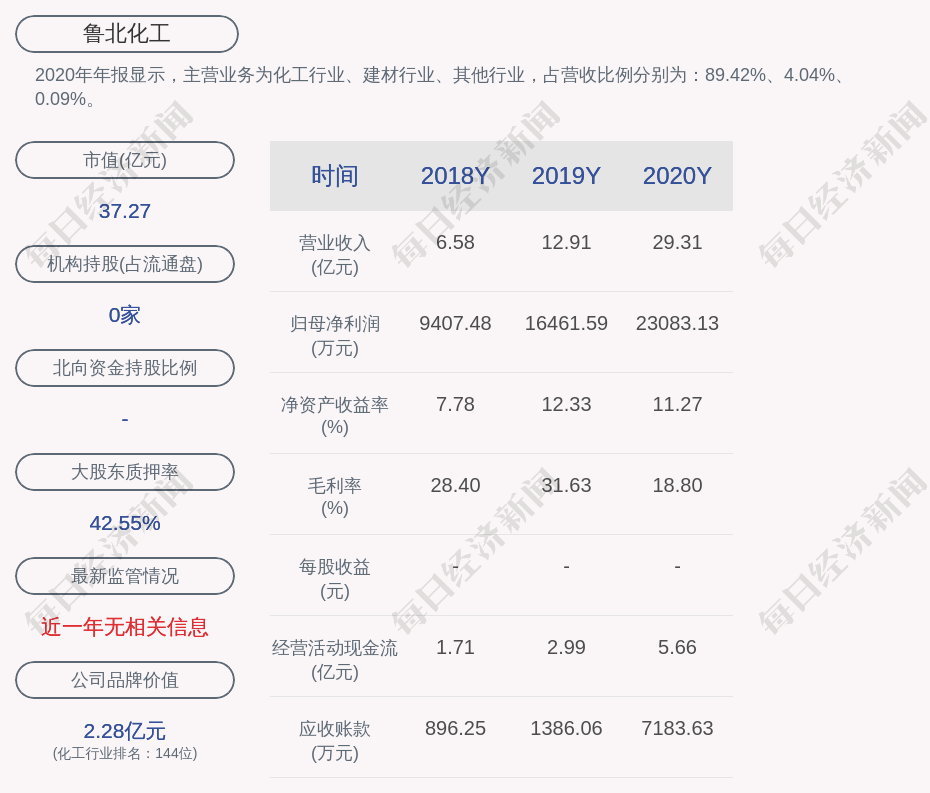 2020年年报显示,鲁北化工的主营业务为化工行业、建材行业、其他行业,占营收比例分别为:89.42%、4.04%、0.09%。