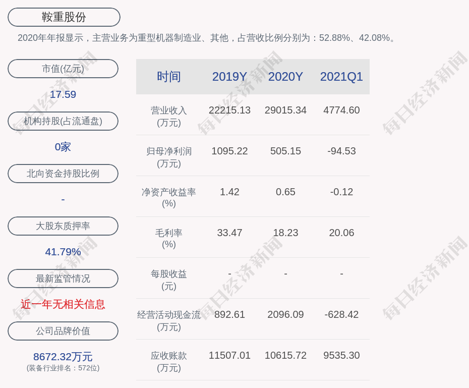 2020年年报显示,鞍重股份的主营业务为重型机器制造业、其他,占营收比例分别为:52.88%、42.08%。