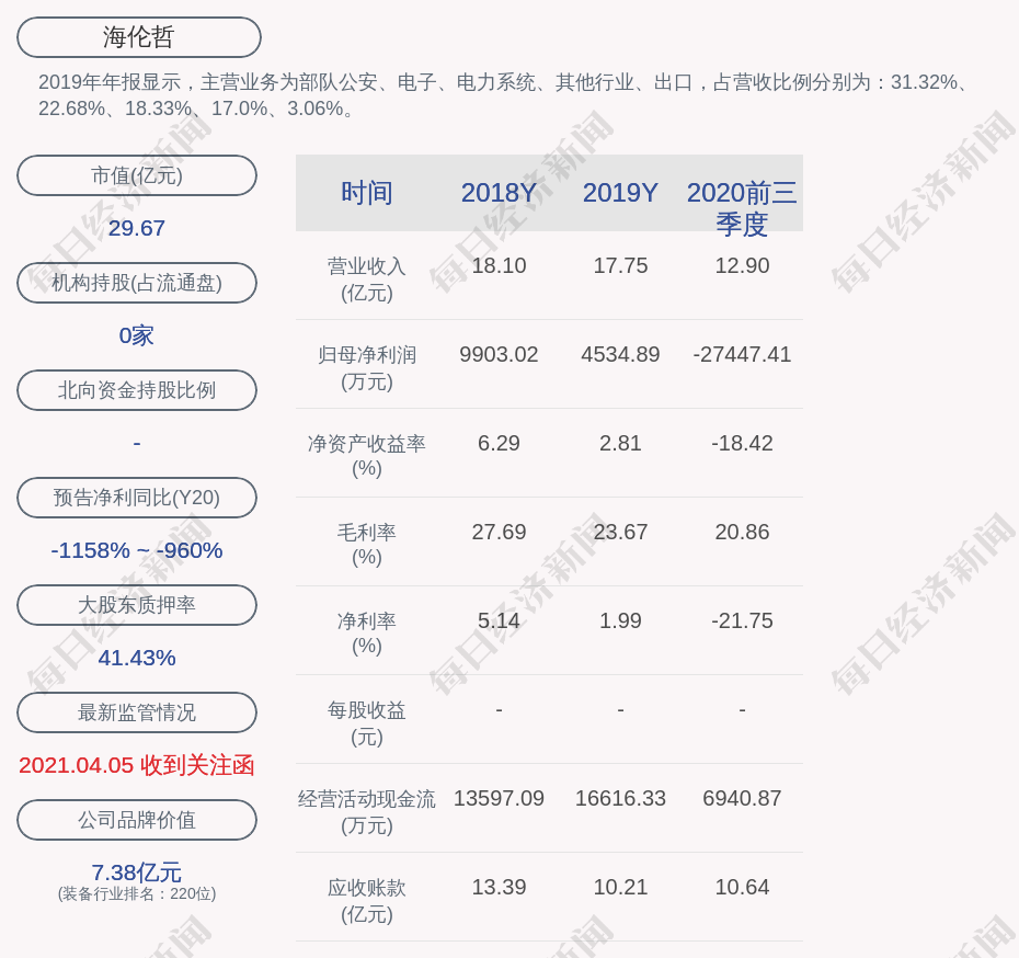 每经AI快讯,海伦哲(SZ 300201,收盘价:2.85元)4月19日晚间发布公告称,公司控股股东的一致行动人机电公司于2021年4月16日质押3825万股,占其所持股份比例为23.49%。