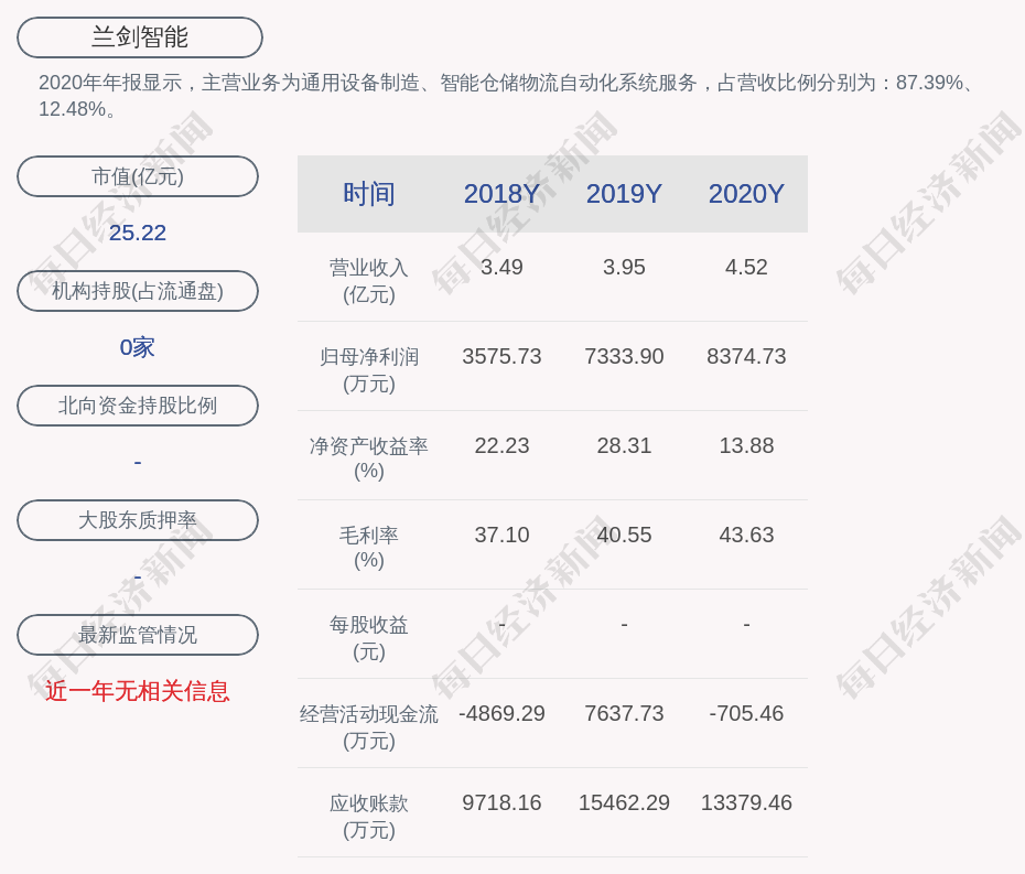 2020年年报显示,兰剑智能的主营业务为通用设备制造、智能仓储物流自动化系统服务,占营收比例分别为:87.39%、12.48%。