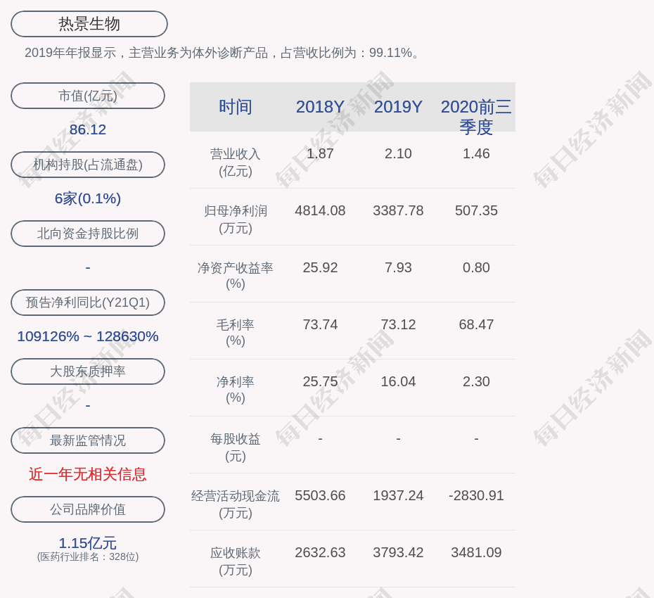 2019年年报显示,热景生物的主营业务为体外诊断产品,占营收比例为:99.11%。