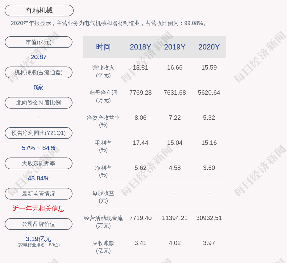 2020年年报显示,奇精机械的主营业务为电气机械和器材制造业,占营收比例为:99.08%。