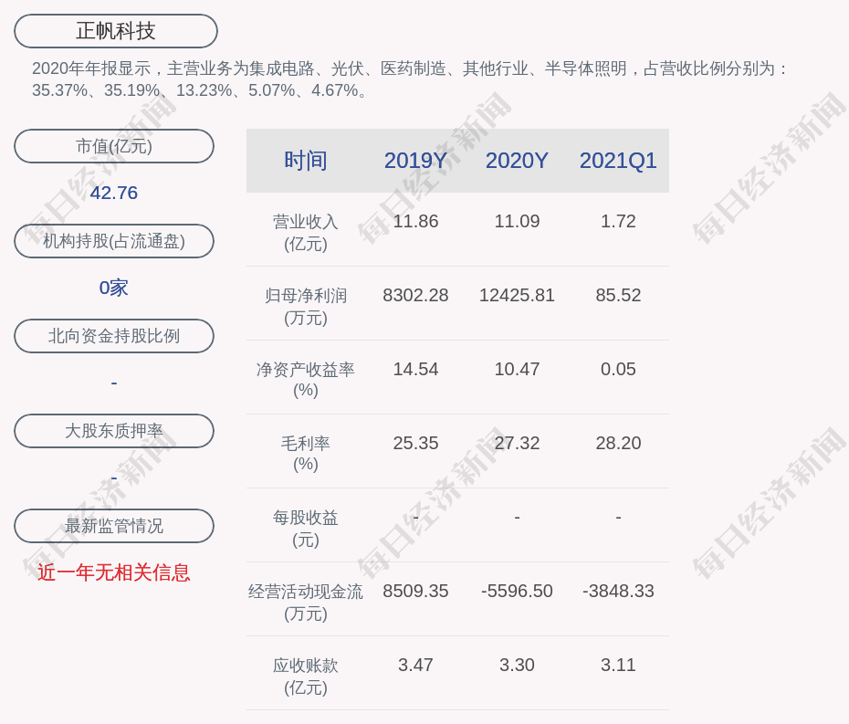 2020年年报显示,正帆科技的主营业务为集成电路、光伏、医药制造、其他行业、半导体照明,占营收比例分别为:35.37%、35.19%、13.23%、5.07%、4.67%。