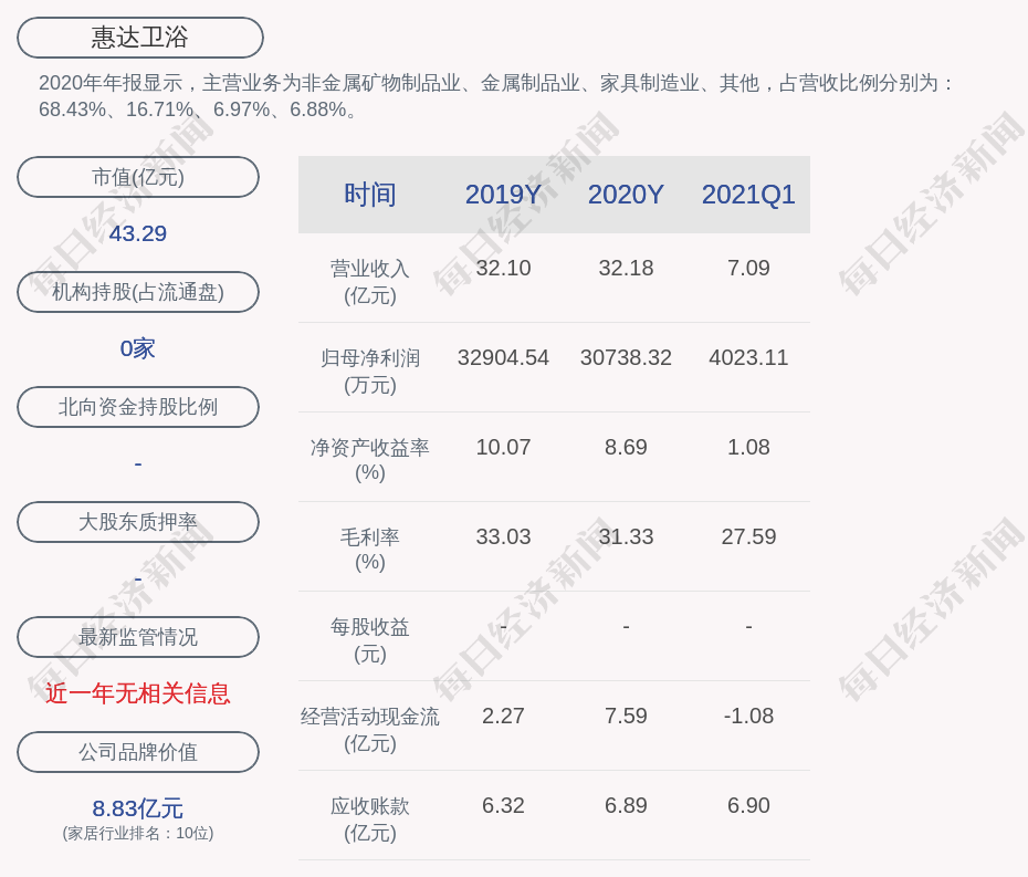 2020年年报显示,惠达卫浴的主营业务为非金属矿物制品业、金属制品业、家具制造业、其他,占营收比例分别为:68.43%、16.71%、6.97%、6.88%。