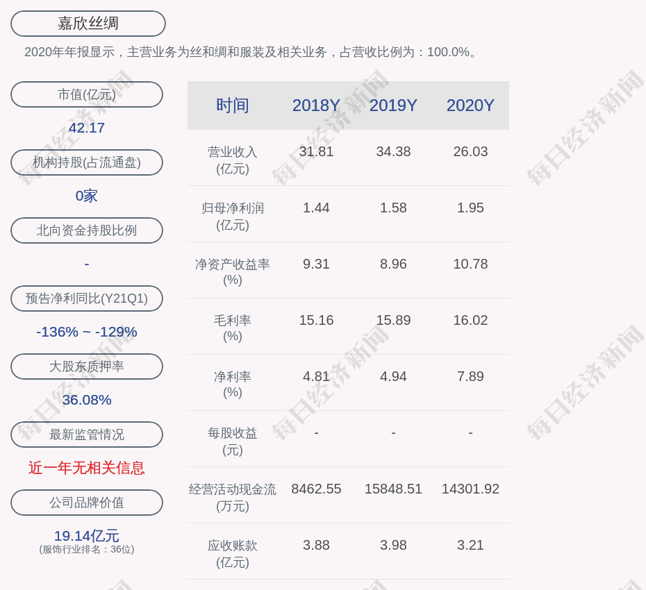 2020年年报显示,嘉欣丝绸的主营业务为丝和绸和服装及相关业务,占营收比例为:100.0%。