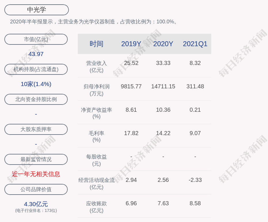 2020年半年报显示,中光学的主营业务为光学仪器制造,占营收比例为:100.0%。