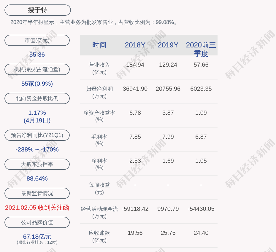2020年半年报显示,搜于特的主营业务为批发零售业,占营收比例为:99.08%。