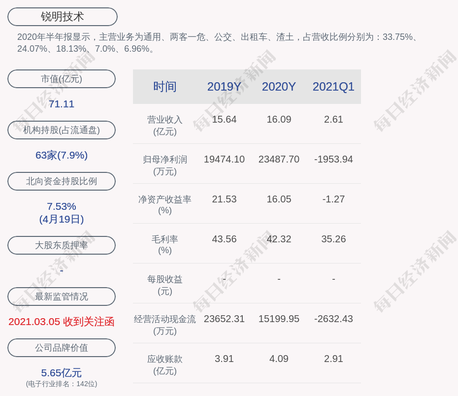 2020年半年报显示,锐明技术的主营业务为通用、两客一危、公交、出租车、渣土,占营收比例分别为:33.75%、24.07%、18.13%、7.0%、6.96%。