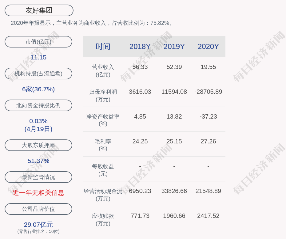2020年年报显示,友好集团的主营业务为商业收入,占营收比例为:75.82%。