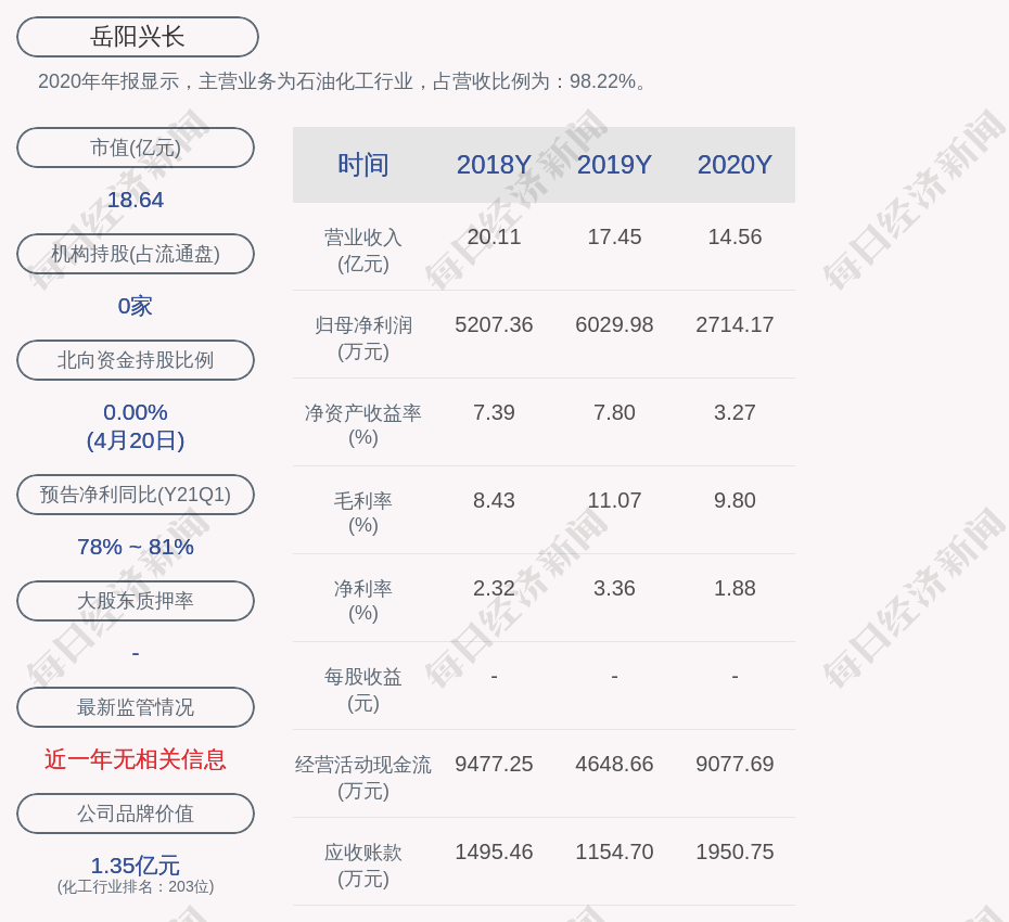 2020年年报显示,岳阳兴长的主营业务为石油化工行业,占营收比例为:98.22%。