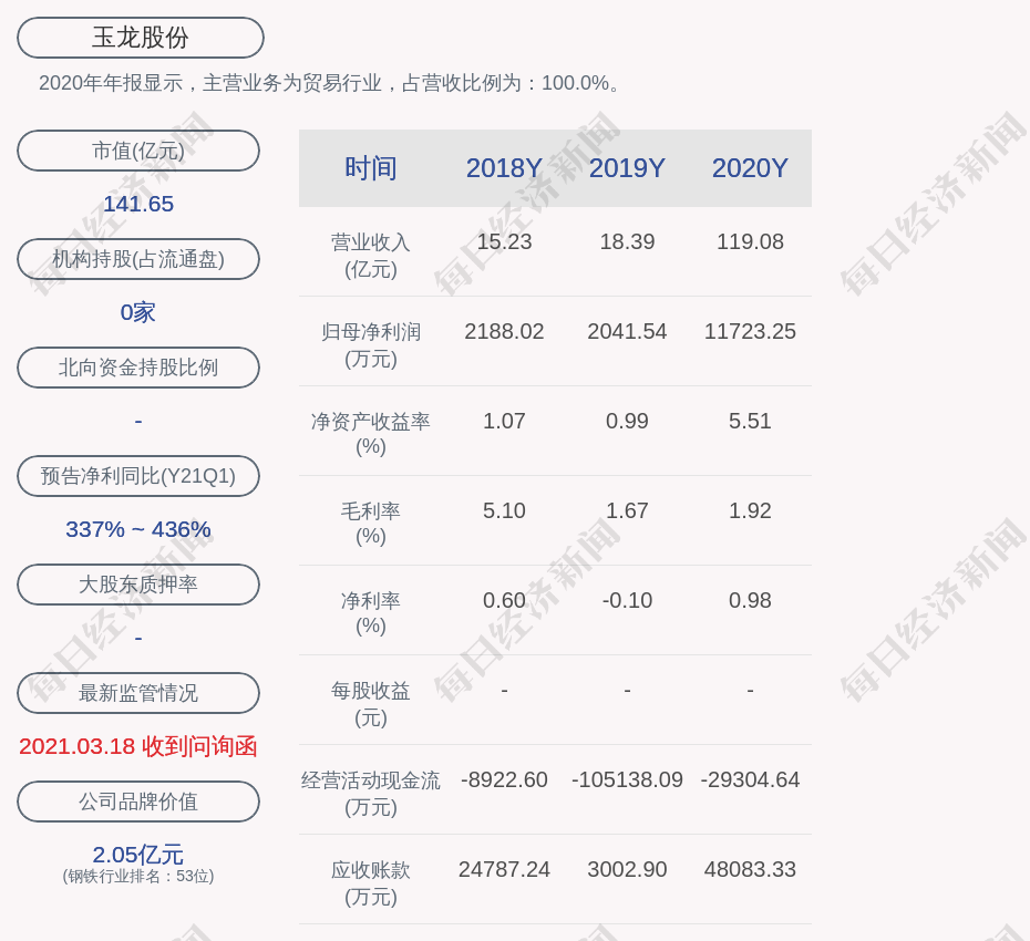 2020年年报显示,玉龙股份的主营业务为贸易行业,占营收比例为:100.0%。