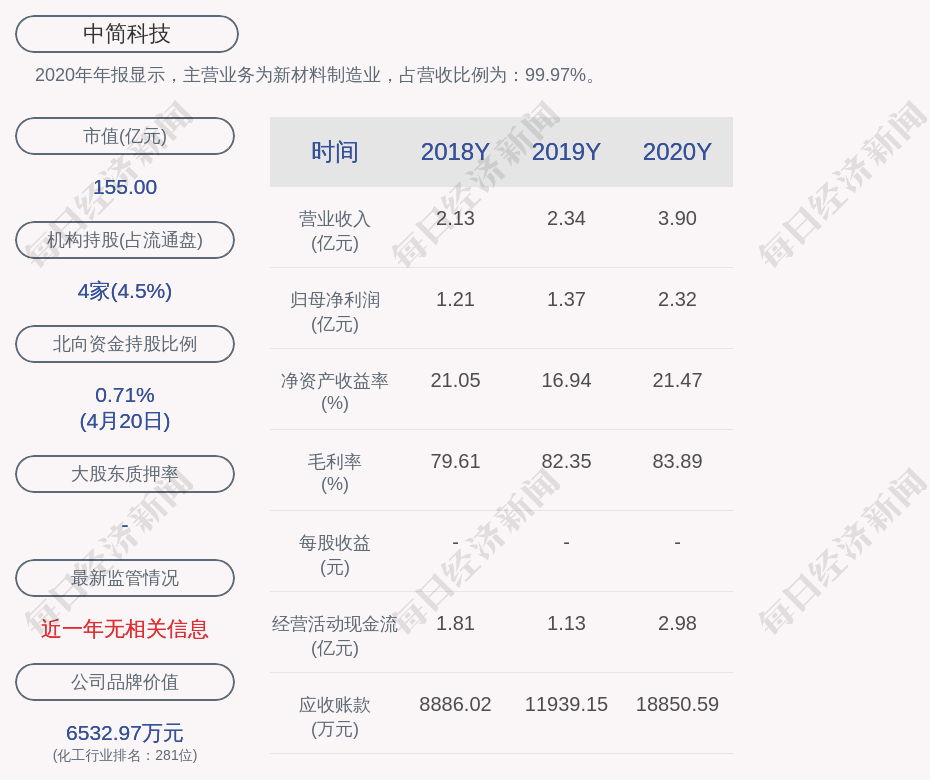 2020年年报显示,中简科技的主营业务为新材料制造业,占营收比例为:99.97%。