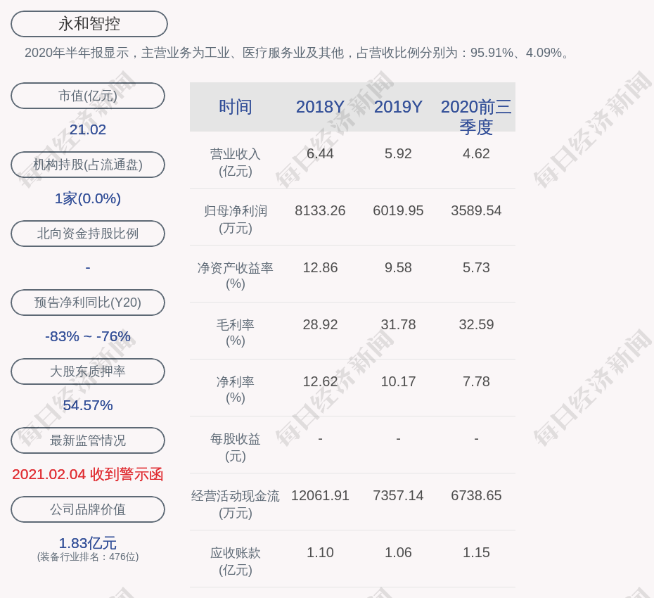 2020年半年报显示,永和智控的主营业务为工业、医疗服务业及其他,占营收比例分别为:95.91%、4.09%。