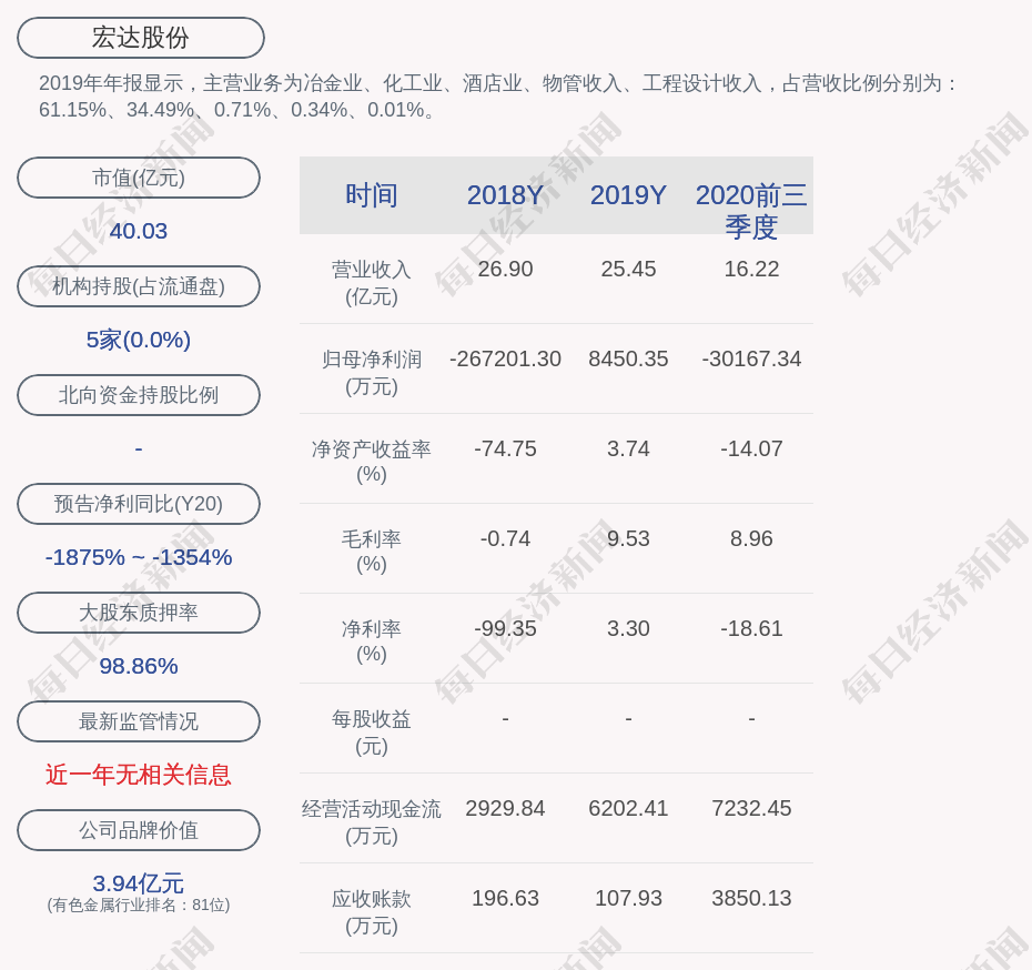 2019年年报显示,宏达股份的主营业务为冶金业、化工业、酒店业、物管收入、工程设计收入,占营收比例分别为:61.15%、34.49%、0.71%、0.34%、0.01%。