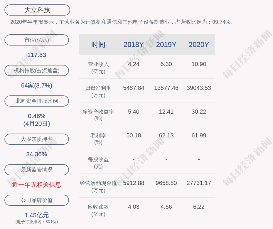 2020年半年报显示,大立科技的主营业务为计算机和通信和其他电子设备制造业,占营收比例为:99.74%。
