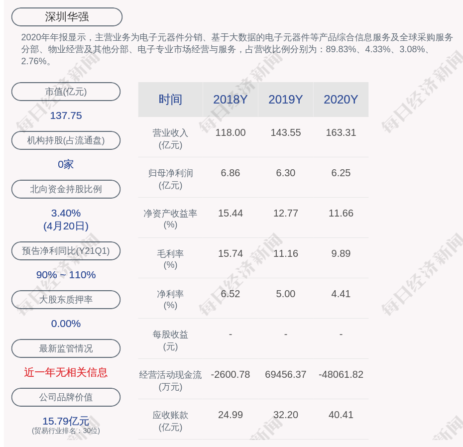 2020年年报显示,深圳华强的主营业务为电子元器件分销、基于大数据的电子元器件等产品综合信息服务及全球采购服务分部、物业经营及其他分部、电子专业市场经营与服务,占营收比例分别为:89.83%、4.33%、3.08%、2.76%。