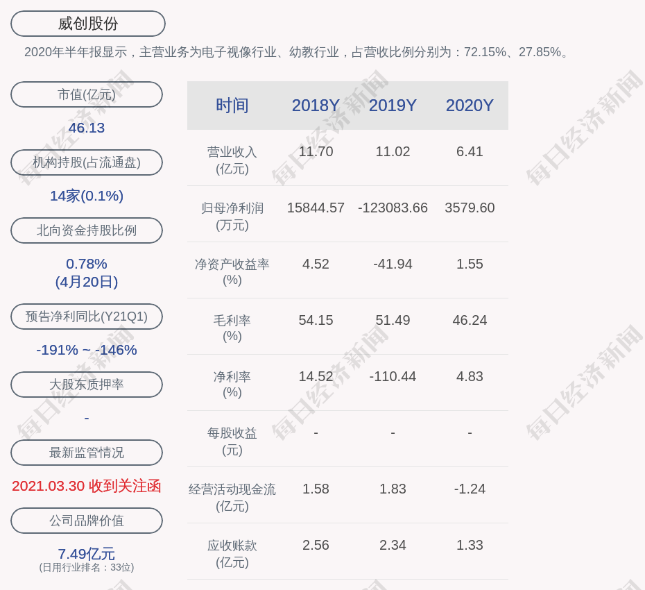 2020年半年报显示,威创股份的主营业务为电子视像行业、幼教行业,占营收比例分别为:72.15%、27.85%。