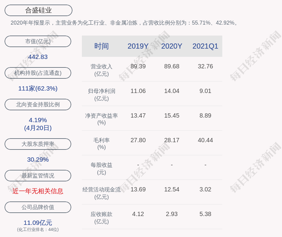 2020年年报显示,合盛硅业的主营业务为化工行业、非金属冶炼,占营收比例分别为:55.71%、42.92%。