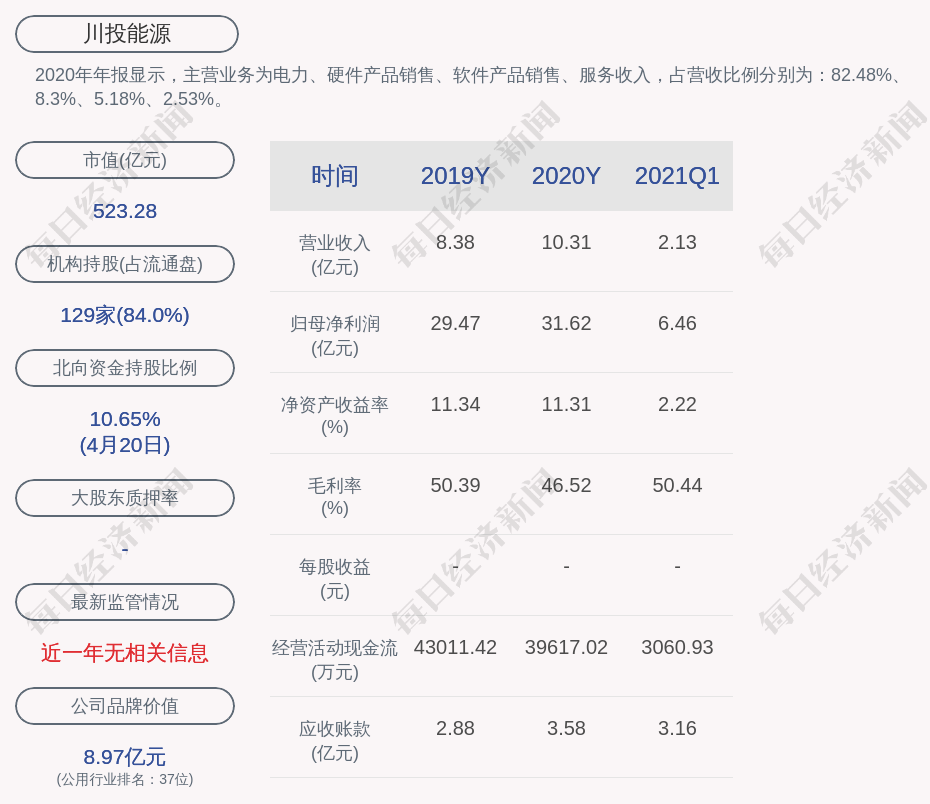 2020年年报显示,川投能源的主营业务为电力、硬件产品销售、软件产品销售、服务收入,占营收比例分别为:82.48%、8.3%、5.18%、2.53%。