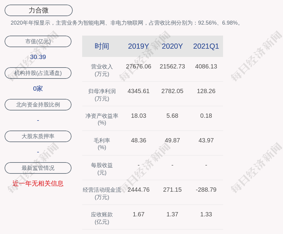 2020年年报显示,力合微的主营业务为智能电网、非电力物联网,占营收比例分别为:92.56%、6.98%。