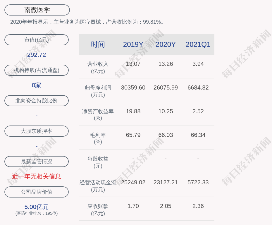 2020年年报显示,南微医学的主营业务为医疗器械,占营收比例为:99.81%。