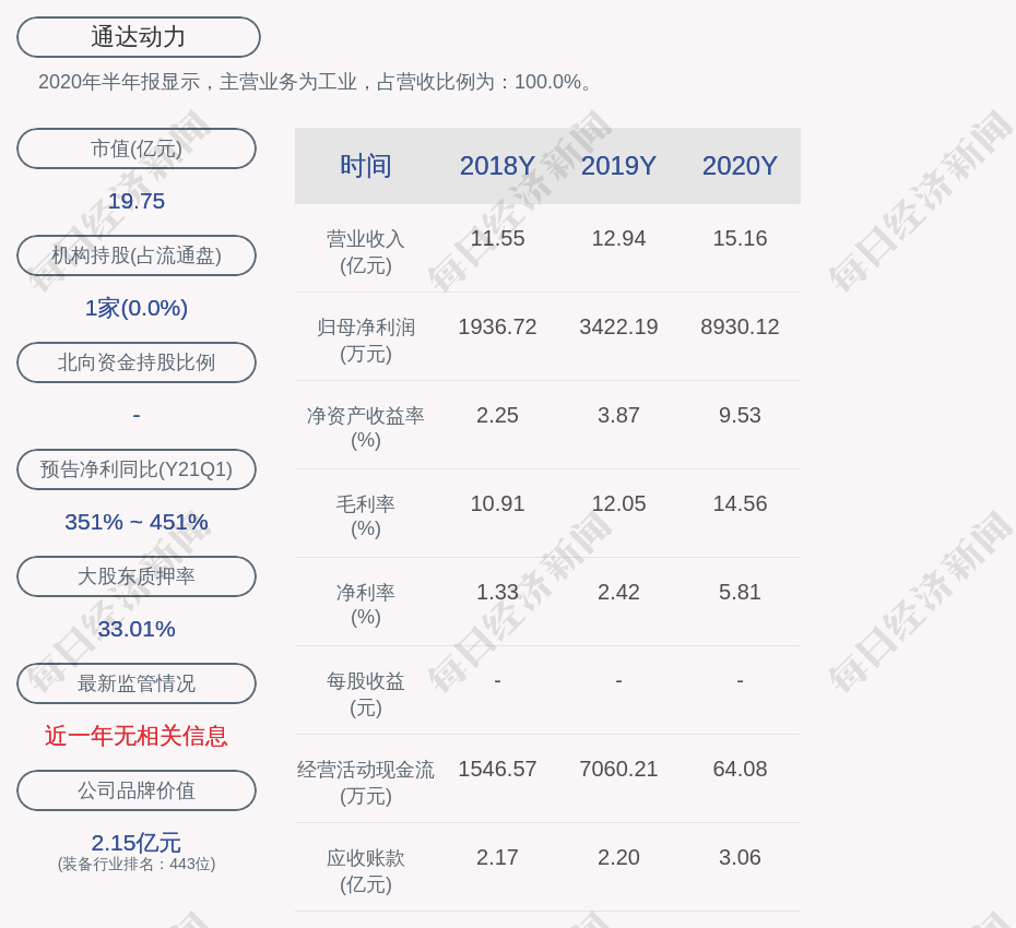2020年半年报显示,通达动力的主营业务为工业,占营收比例为:100.0%。