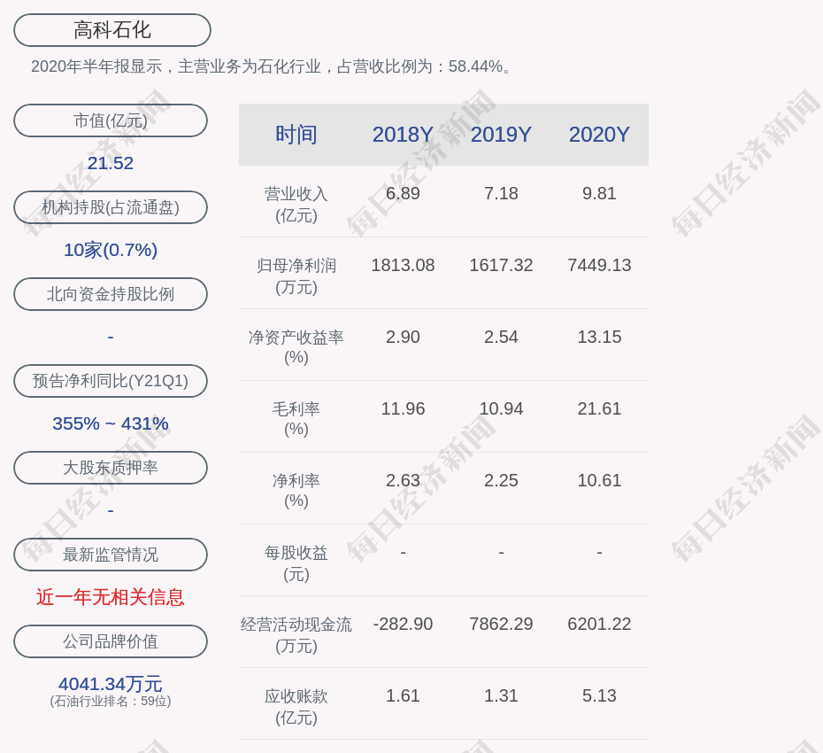 2020年半年报显示,高科石化的主营业务为石化行业,占营收比例为:58.44%。