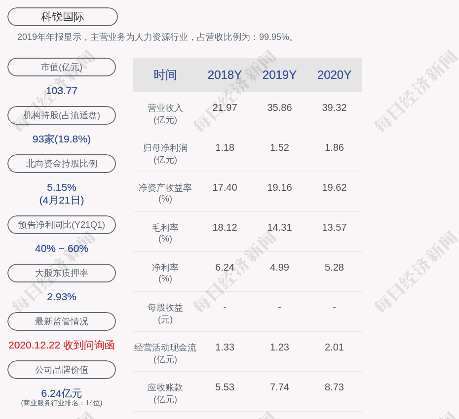 2019年年报显示,科锐国际的主营业务为人力资源行业,占营收比例为:99.95%。