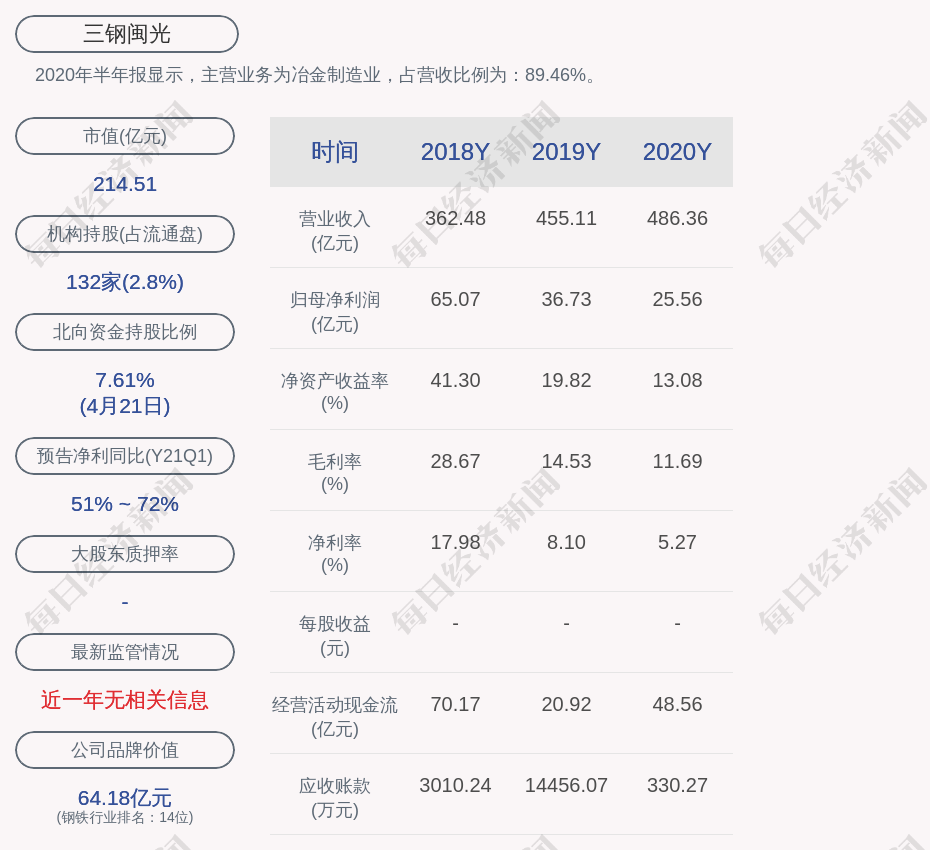 2020年半年报显示,三钢闽光的主营业务为冶金制造业,占营收比例为:89.46%。