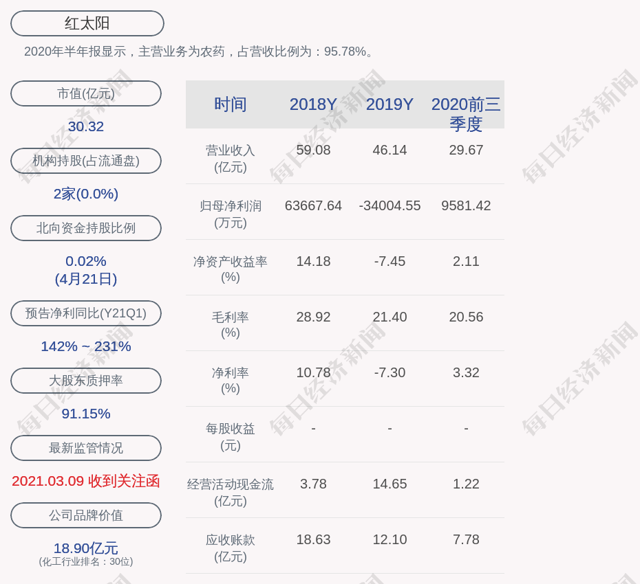 2020年半年报显示,红太阳的主营业务为农药,占营收比例为:95.78%。