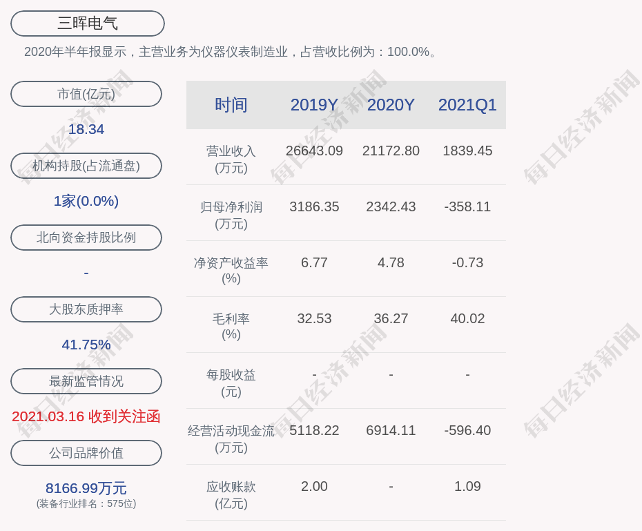 2020年半年报显示,三晖电气的主营业务为仪器仪表制造业,占营收比例为:100.0%。