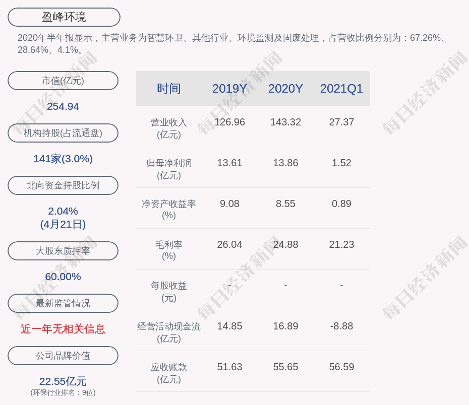 2020年半年报显示,盈峰环境的主营业务为智慧环卫、其他行业、环境监测及固废处理,占营收比例分别为:67.26%、28.64%、4.1%。