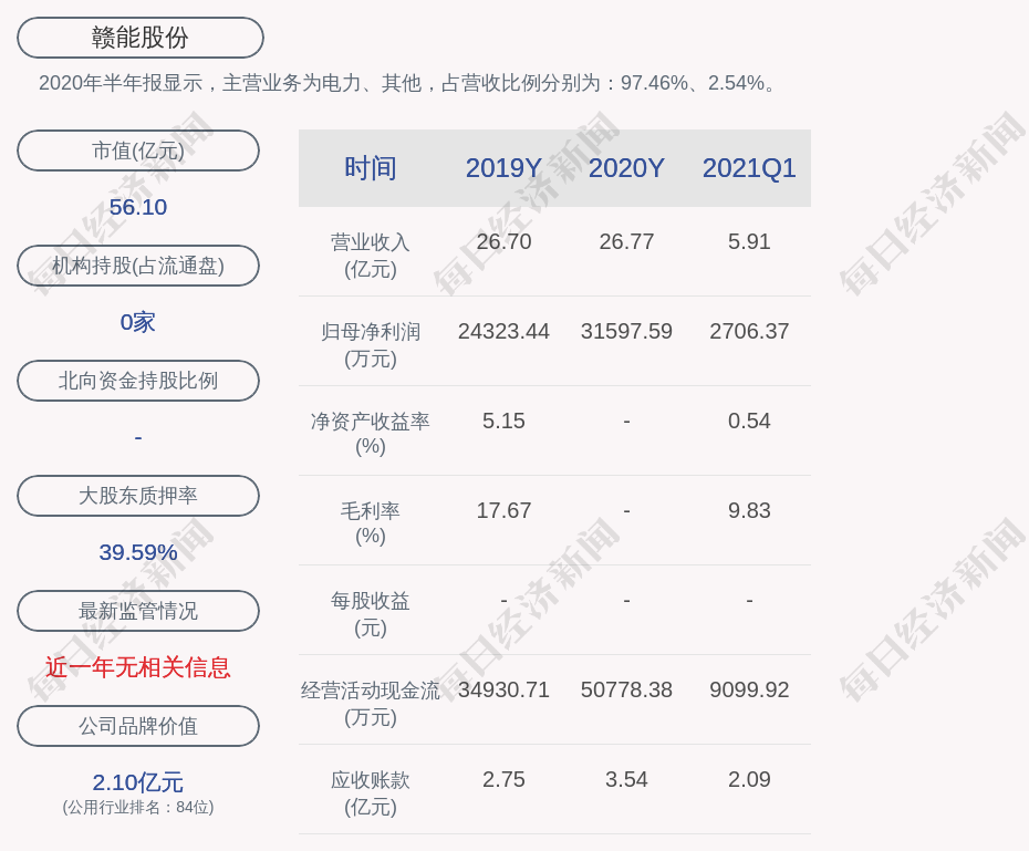 2020年半年报显示,赣能股份的主营业务为电力、其他,占营收比例分别为:97.46%、2.54%。