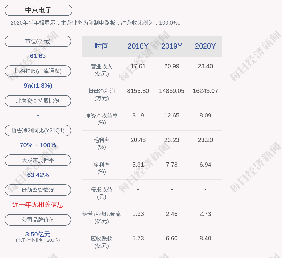 2020年半年报显示,中京电子的主营业务为印制电路板,占营收比例为:100.0%。
