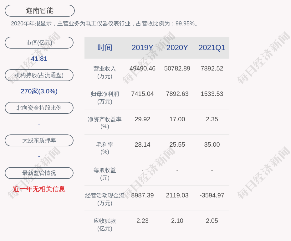 2020年年报显示,迦南智能的主营业务为电工仪器仪表行业,占营收比例为:99.95%。