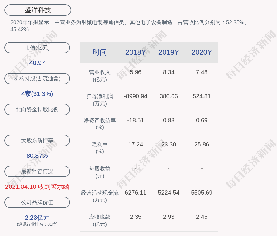 2020年年报显示,盛洋科技的主营业务为射频电缆等通信类、其他电子设备制造,占营收比例分别为:52.35%、45.42%。