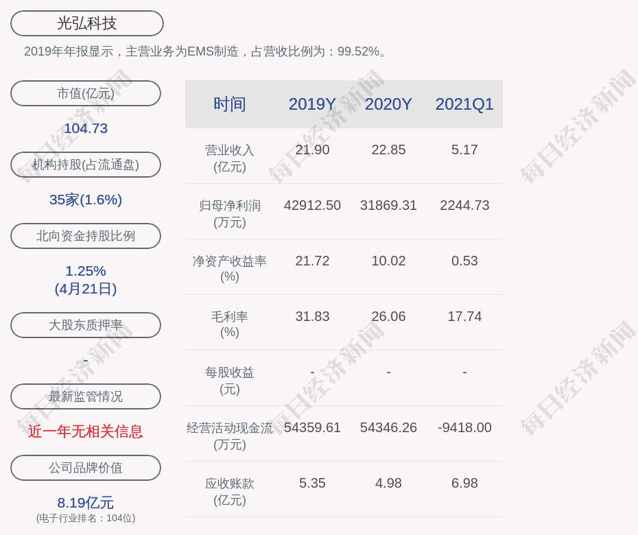 2019年年报显示,光弘科技的主营业务为EMS制造,占营收比例为:99.52%。